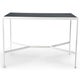 - Tabletop is white porcelain enamel on steel, vertical grain teak, or glass