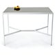 - Tabletop is white porcelain enamel on steel, vertical grain teak, or glass
