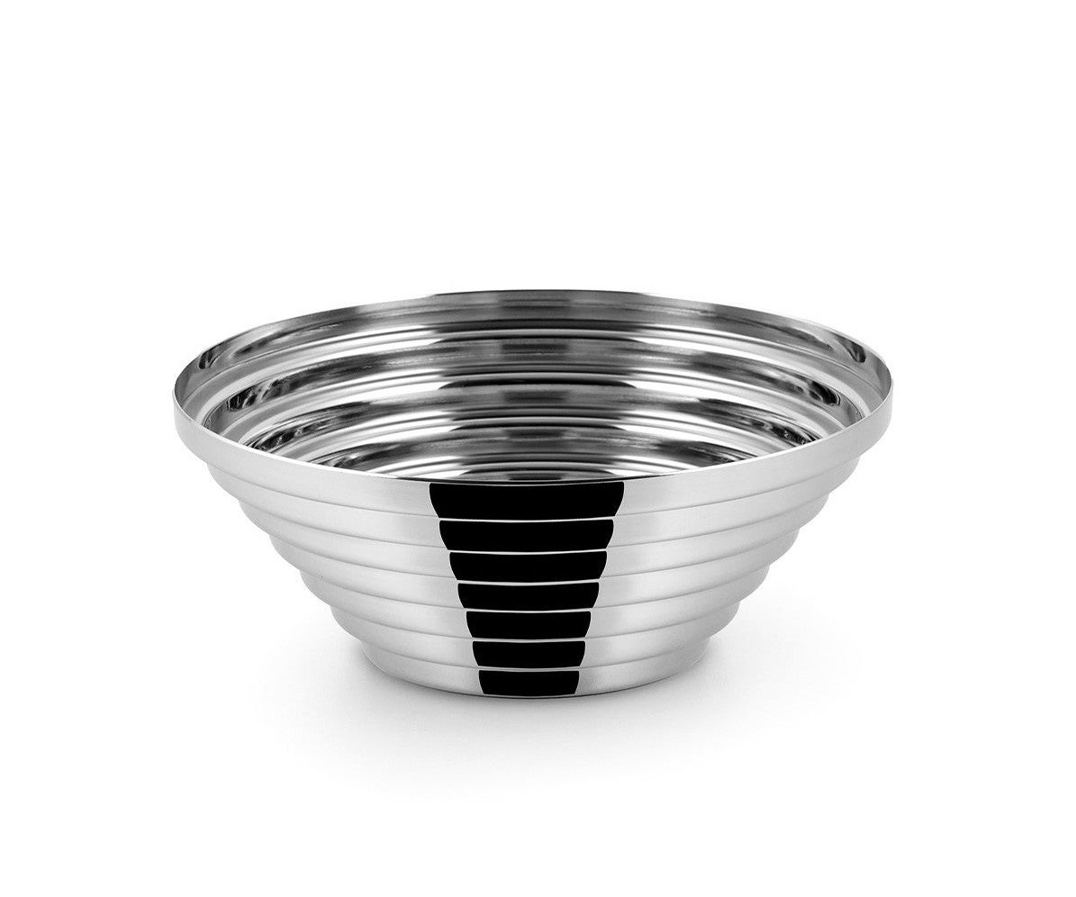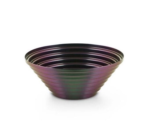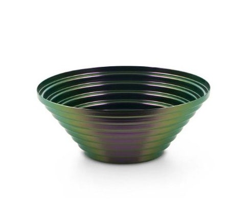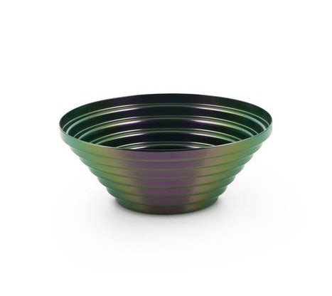 The Maya basket has an essential and at the same time mysteriously reflective line. A true graphic design that evolved in three dimensions and was translated into sheet steel by cold forming, born in the 1970s by the hand of Giulio Confalonieri. In this edition, with a 25 cm diameter, the elegant original version in polished stainless steel comes to life as two new, complementary, iridescent color versions that move between the color poles of green and violet.