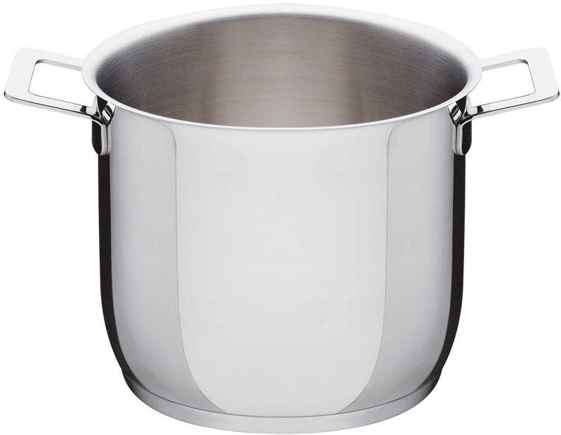 The third series of Alessi pots had the ambitious goal of standing beside Sapper's copper and steel “Cintura di Orione” and also Giovannoni's aluminum-bottomed steel “Mami”, but occupying a much lower price bracket yet maintaining the same high design quality and high attention to functionality. The knob on the cover lets you lift it with a wooden spoon.