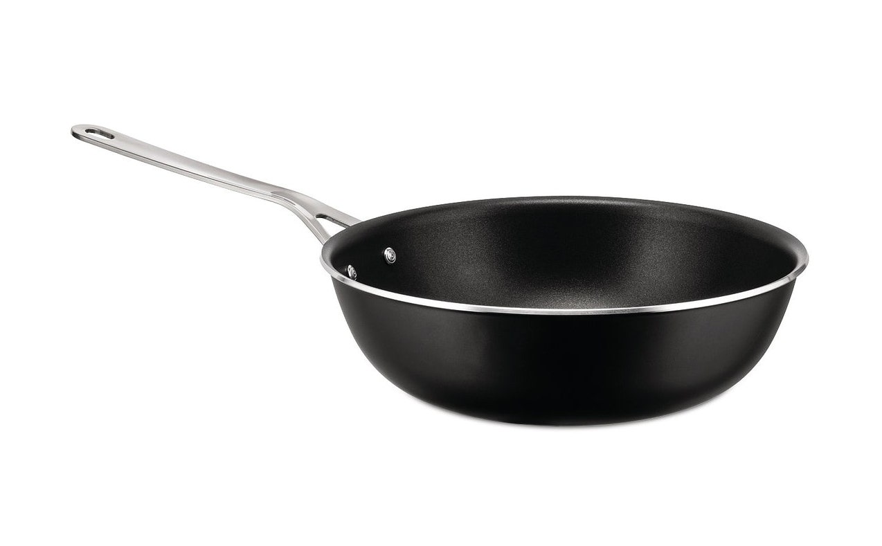 Deep frying pan in aluminum with non-stick interior, black. Handle in 18/10 stainless steel. Magnetic steel bottom suitable for induction cooking.