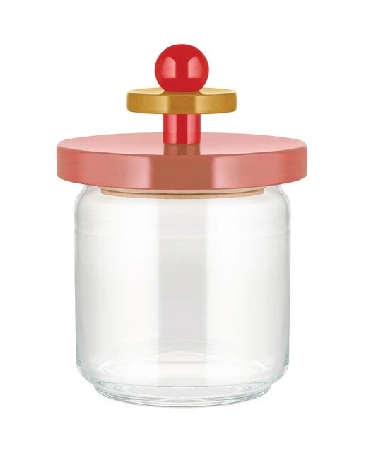 Ettore Sottsass reinterprets a kitchen classic with his hallmark style of overlapping coloured volumes. The ideal jar for storing dry foods such as rice, pasta, biscuits, or powders such as sugar, salt and coffee. The glass body and the hermetic closing keep the flavour and aroma of the products intact.