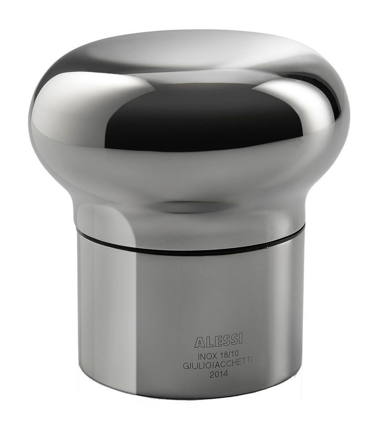 The Bottle stopper designed by Giulio Iacchetti is suitable for both wine and champagne bottles. It's produced in polished steel and has a rubber inner section to close the cap with a pressure and expansion mechanism. Easy to use, insert by pressing and turning clockwise to fit the neck of the bottle. The shape of the object is reminiscent of a classic cork, which hermetically seals champagne bottles and their contents.