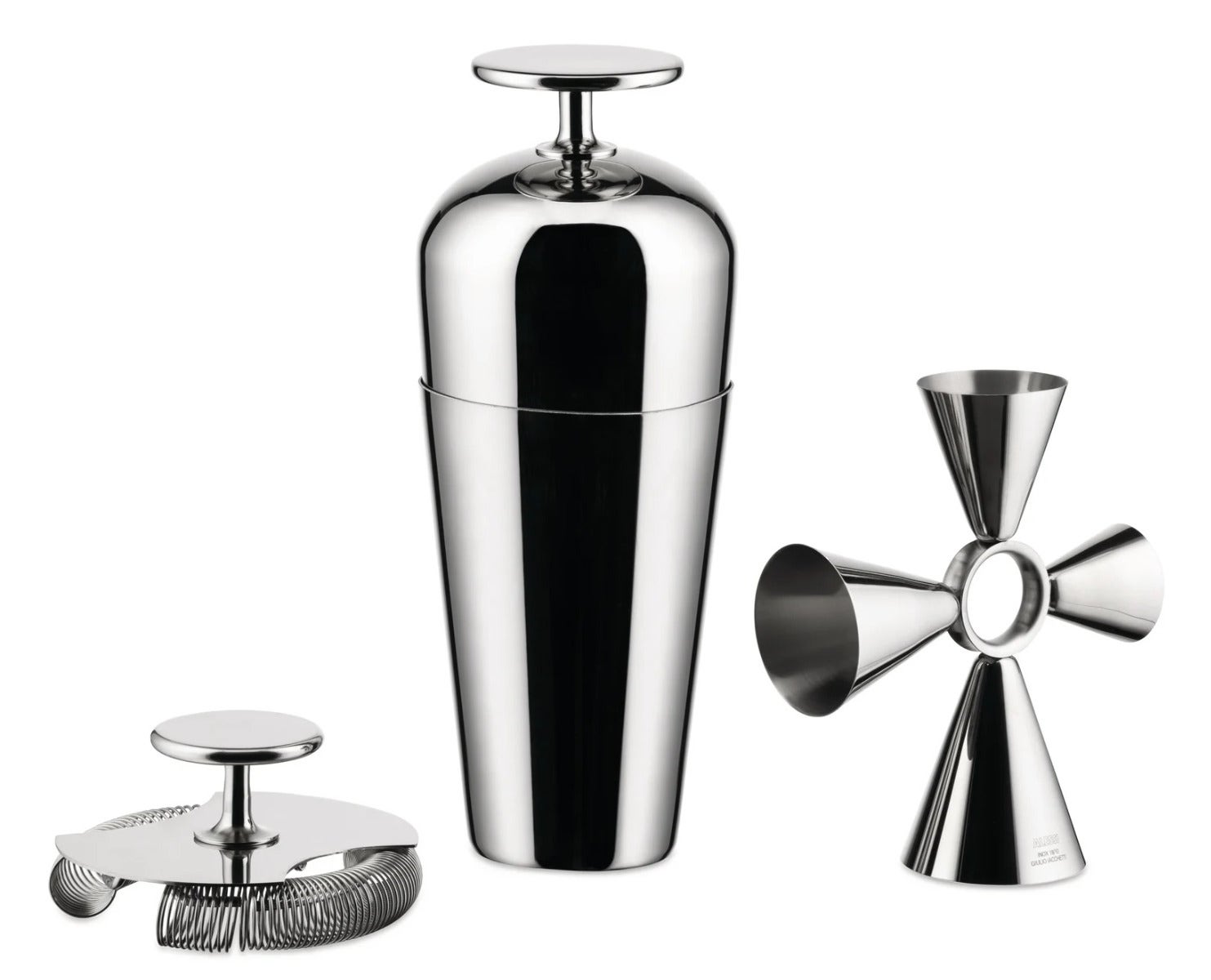 - Set composed of: "Parisienne" cocktail shaker, Double bar strainer, "Quadri Combo Jigger"