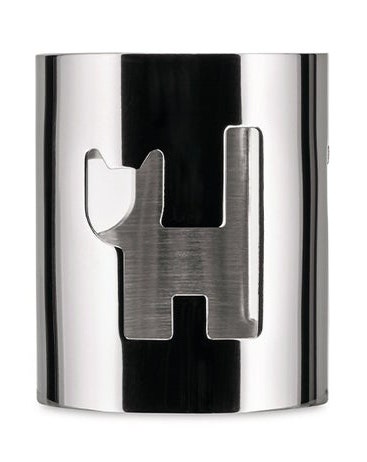 Napkin ring in 18/10 stainless steel, mirror polished, with "bone" hole motif. The napkin rings are a further development of the "cartoon men" motif, created by the King-Kong team of Giovannoni and Venturini and which now command icon status in mirror polished design, based on the use of "affective codes"