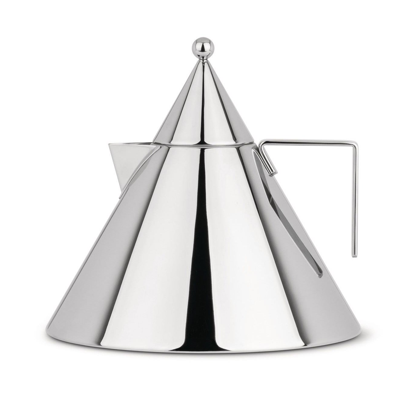 Kettle in 18/10 stainless steel, mirror polished. As with the "La Conica" espresso coffee maker, the link between the shape of Aldo Rossi's kettle and its name is clear. The cones, a constant presence in his architectural designs, are transformed into real obj MORE INFO
