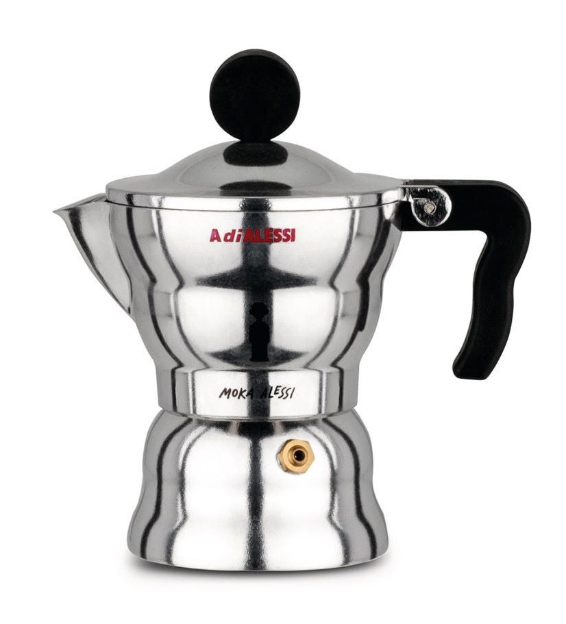 The Moka Alessi coffee maker, created by Alessandro Mendini, has a round shape that expresses its relationship with the traditional moka. An espresso coffee maker in aluminum casting with an ergonomic handle and thermoplastic resin knob. A real and proper eulogy to the daily coffee rite.