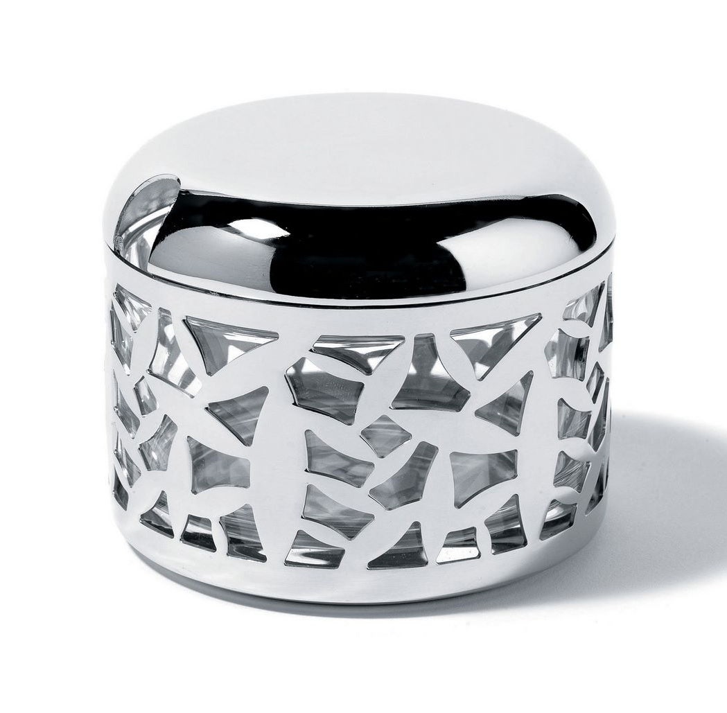 Parmesan cheese cellar in 18/10 stainless steel mirror polished and glass. The parmesan cheese cellar has been designed by Marta Sansoni. It is part of the CACTUS family of objects for the table, characterized by a framework representing a serie of leaves irregularly put one over the other.