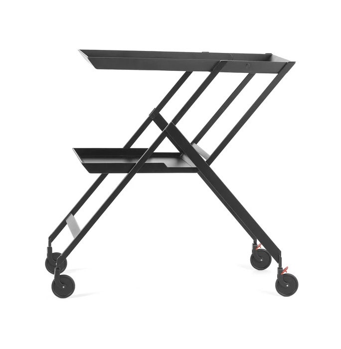 Designed by Richard Sapper in the 1970s, the Plico folding trolley is one of the lesser-known, although most representative, projects of this unforgettable author's work. A handy food trolley that with a simple gesture turns into a table on which to work or have a meal. Easy to close, once folded it is extremely compact and can be stored behind a door or between two kitchen cabinets. Brakes on the rear wheels make it self-supporting when closed.
