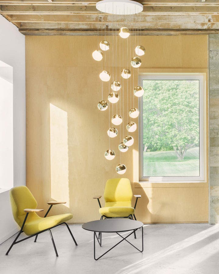 An innovative take on a conventional sphere, the Ohm’s orbiting shade invites curiosity and interaction. Each opal glass orb casts a warm ambient glow, suspended in space by a slim suspension cable. The Ohm can be displayed as a singular pendant or as a cluster.