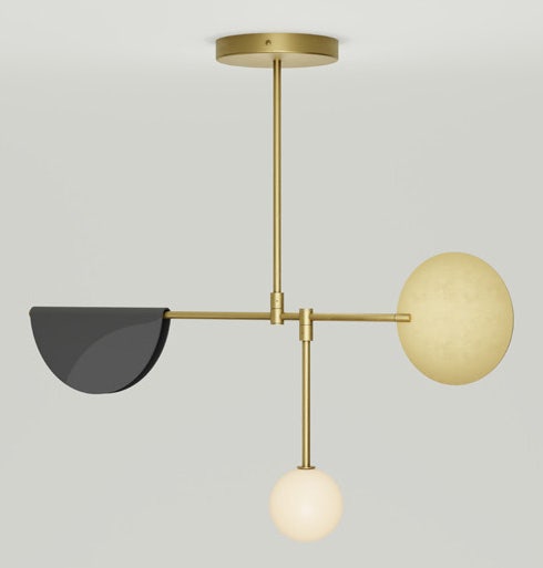 Inspired by the exquisite balancing act found in hanging kinetic mobiles. Phase light is an interpretation of a circle in three forms: a sphere, a disc, and a melted semi-circle. This vertical fixture is built from the bottom up to stay balanced. Every component of each tier is hand finished and weighted precisely before being attached to the arm. Each tier acts as a predictably weighted foundation for the tier above, where the process repeats. Phase conceals its wires inside the arms while maintaining perfect parallel line structures. Rather than relying on adjustable parts—which shift over time and alter the geometry of the fixture—Phase achieves a fixed equilibrium with weight and steel piping.