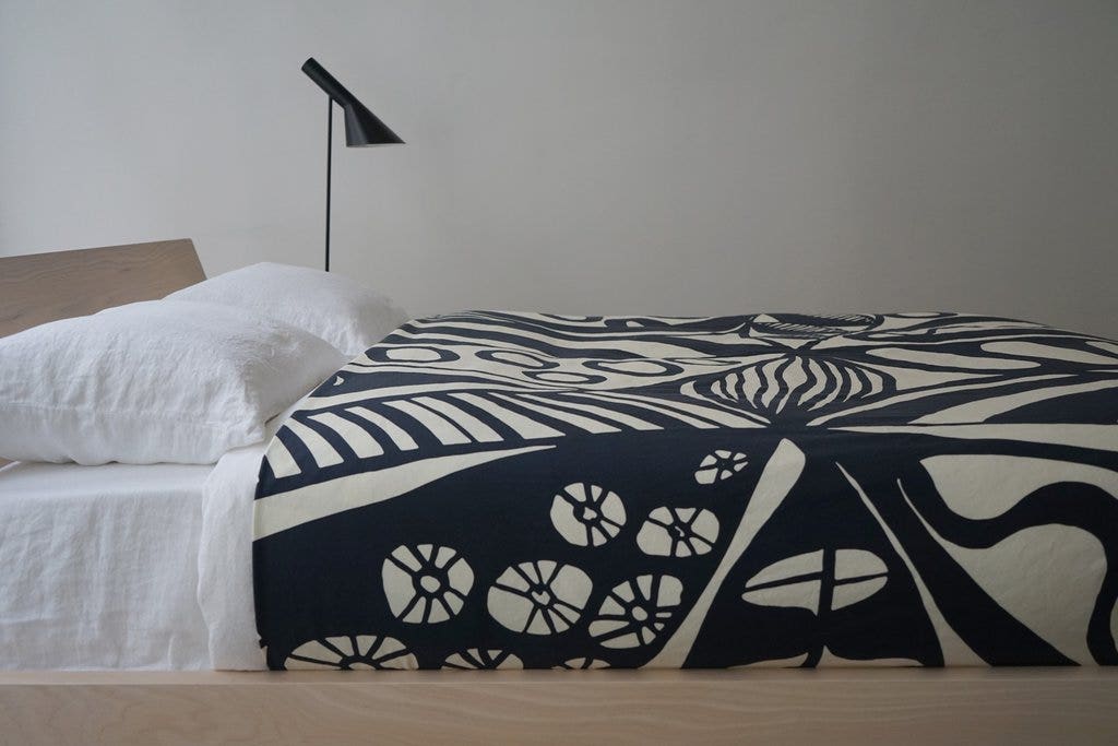 The coverlet comes tucked inside a matching tote bag. Unlike most graphic printed blankets, the pattern on NATURE doesn't repeat.