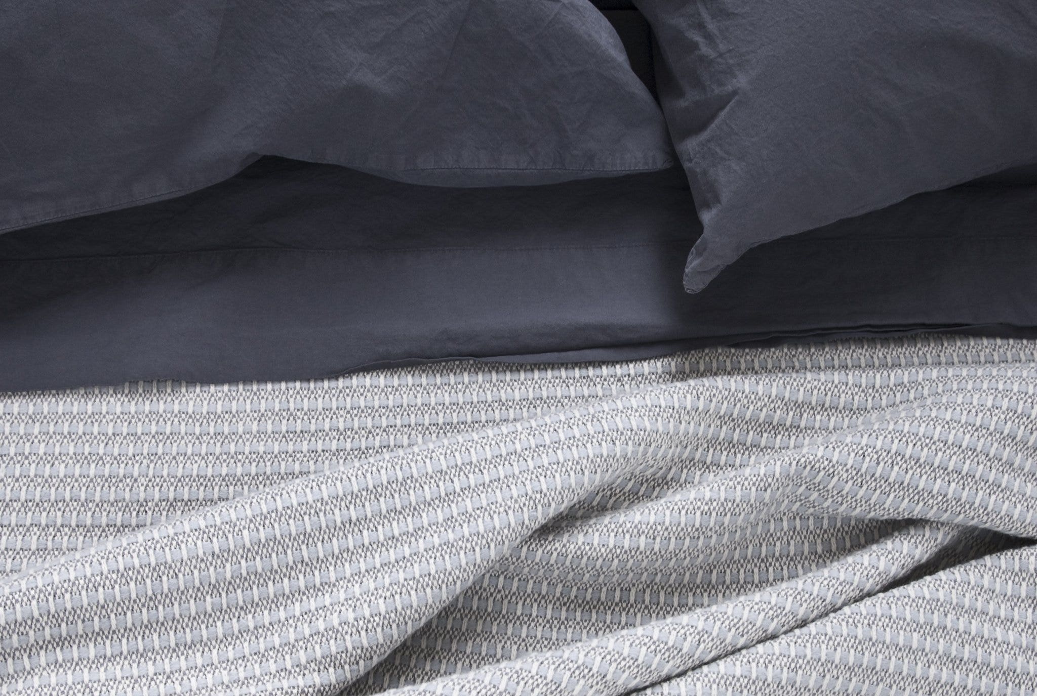 The THEO blanket is a quietly intricate, three-color weave integrating repeats of two shades of finer yarn with a broader, fluffier yarn for a cozily dimensional, knitted look and feel, in mid-to-heavyweight cotton.