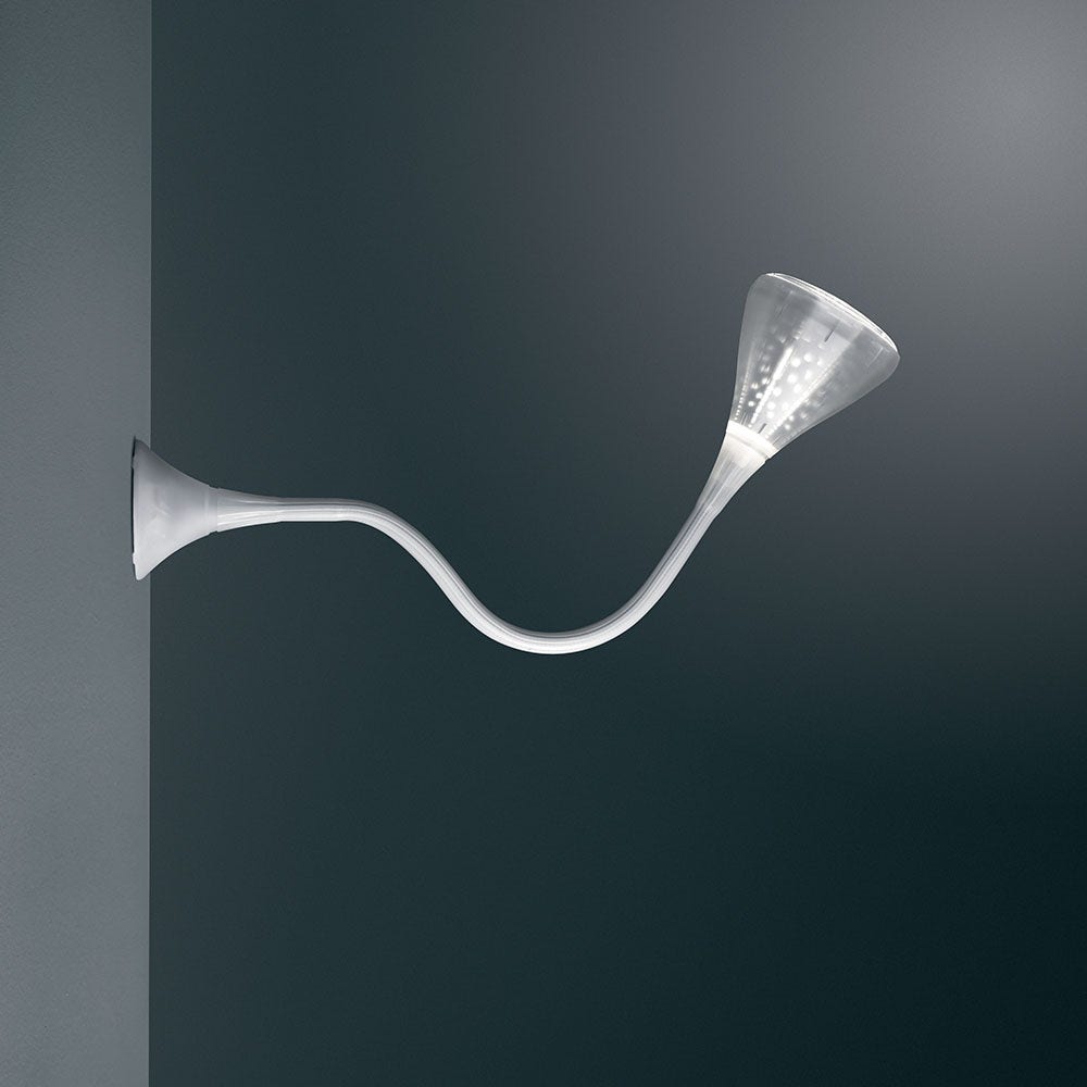 Wall/ceiling lamp with flexible painted steel structure, covered with a natural anti-yellowing silicone case; wall attachment and diffuser in transparent rubber-effect painted polycarbonate; mirror aluminum reflector with random perforations; painted steel bottom plate.