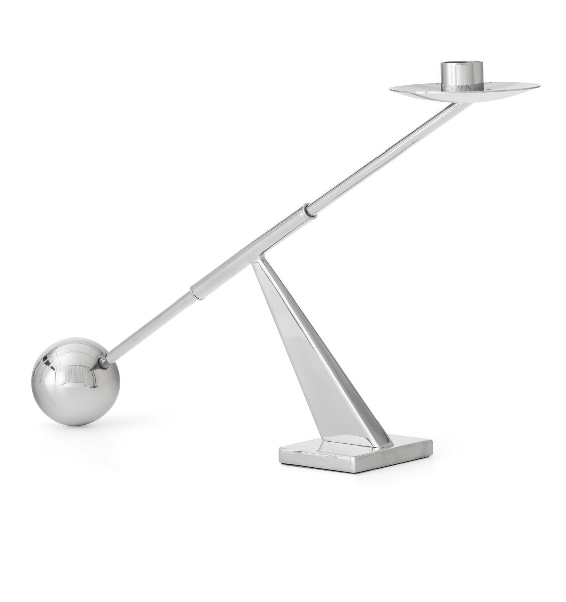 Interconnect Candle Holder is a bold and illuminating centrepiece of exaggerated proportions, designed by Colin King. As a source of cosy candlelight, it is characterised by its deceptively simple geometric form: a sphere, an angle and a line, which unite to create a unique design. It goes beyond its intended use to function as a sculpture.