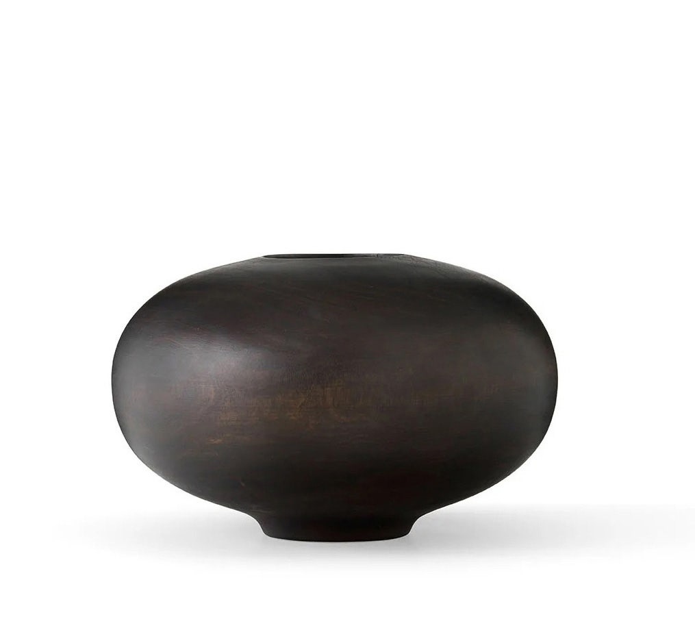 The Surround Vase is shaped from a single piece of solid wood that displays unique natural grain patterns. The rotund, tactile design, created by master stylist Colin King, is equally impactful styled with a few stems of flowers as it is left unfilled.