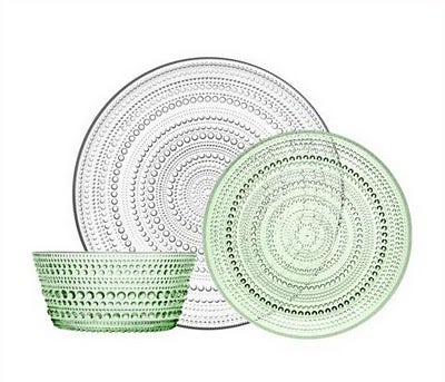 Kastehelmi Bowl in Apple GreenThese pieces feel wonderful to touch, as the round beads adorn the surface of the glass in various sizes and patterns. The interior of the dishes are smooth, making them completely functional as well as beautiful. Mix them in with other Iittala pieces as accent dishes, or use the bowls for special candies and the large plate as a platter.