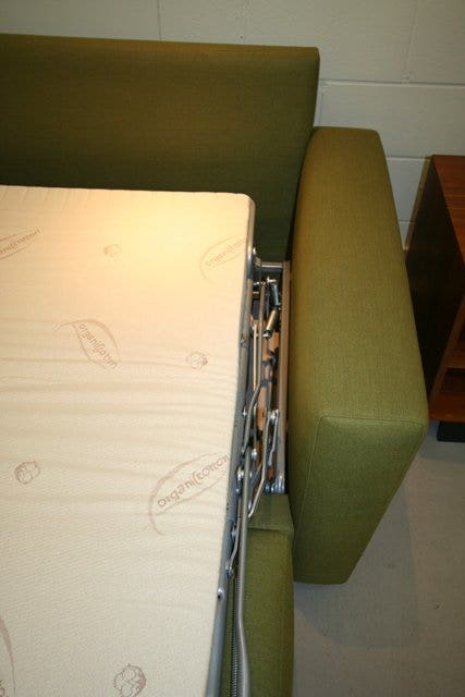 The mattress inside this sofa is 100% natural latex, so there are no creaky metal springs. The mechanism is Italian made and operates unlike any other pull out sofa. There is a handle hidden between the two back cushions and when you pull it towards you, the entire back swings out in one easy motion. The back cushions are permanently attached and safely store themselves underneath the bed, up off the floor.