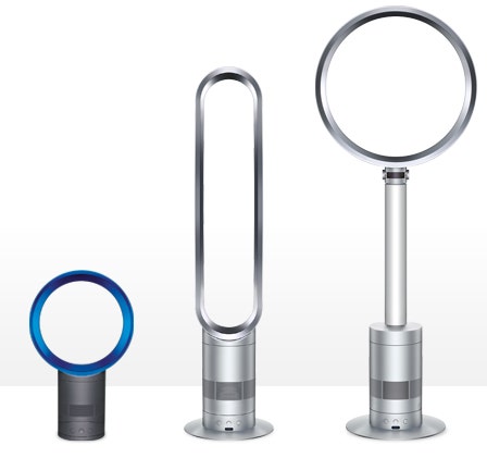 Dyson Air Multiplyers in our ShowroomDyson likes to take every day products and re-design them so they're higher performance, longer lasting, and WAY better looking. This fan is an apt example of these efforts. Blade free, the air multiplier sucks in air from the base of the pedestal, circulates around the fan loop, and distributes it out a 1mm gap in a solid, smooth stream. The loop is slightly angled and uses aircraft technology to amplify air flow 15 times. Available in table top and pedestal versions, this fan is for everyone and every room.