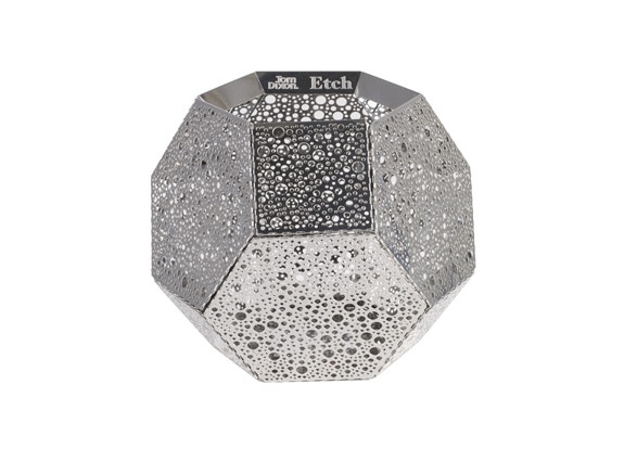 Etch Candle Holder in stainless steel by Tom Dixon - photo: tomdixon.netThese shades are not only industrial in the aesthetic sense of the word, they are actually produced using the same process that is used to create electronic parts. Alternative use of an intricate tool creates a perfect maze of shadows when lit.