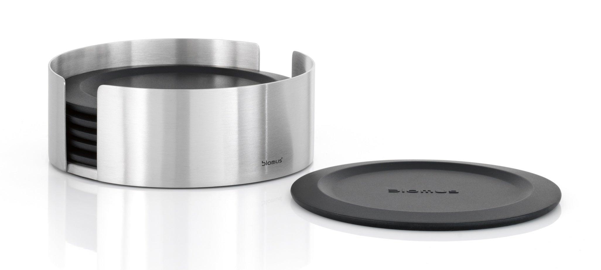 The blomus Silicone Coasters with Stainless Steel Holder come as a set of 6 and feature a circular shape to accommodate glasses well. The silicone coasters are stored, ready to use, inside the stainless steel tray.