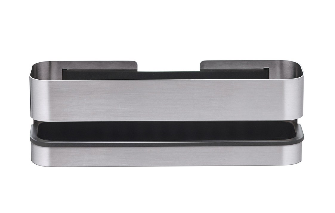 Nexio Modern Stainless Steel Shower Shelf - Large by blomus provides storage and organization to the bath or shower. Keeps any shower tidy and has space for all necessary items. Stainless steel basket contains a plastic tray that can be removed and cleaned. Also features a wide elastic band inside the basket that holds smaller items in place, such as an upturned shampoo bottle or razor.