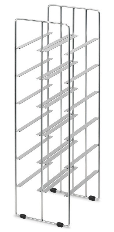The blomus Pilare wine rack is designed for counter top or floor use. A true space saver, this wire shelf holds 12 bottles. Straightforward edges cradle wine bottle perfectly. Rubber bottom pegs prevent scratching or sliding.