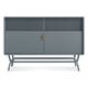 Perforated steel door front allows use of remotes without spoiling the view. Brass details and powder-coated steel base.