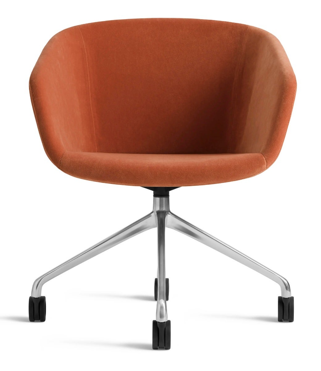Graceful contours, tuned proportions and an aluminum base make for one heck of a power pose. A fully-upholstered back and well-padded bucket seat eliminate discomfort and bring harmony to your home office. Soft facet back detail adds a satisfying bit of office drama.