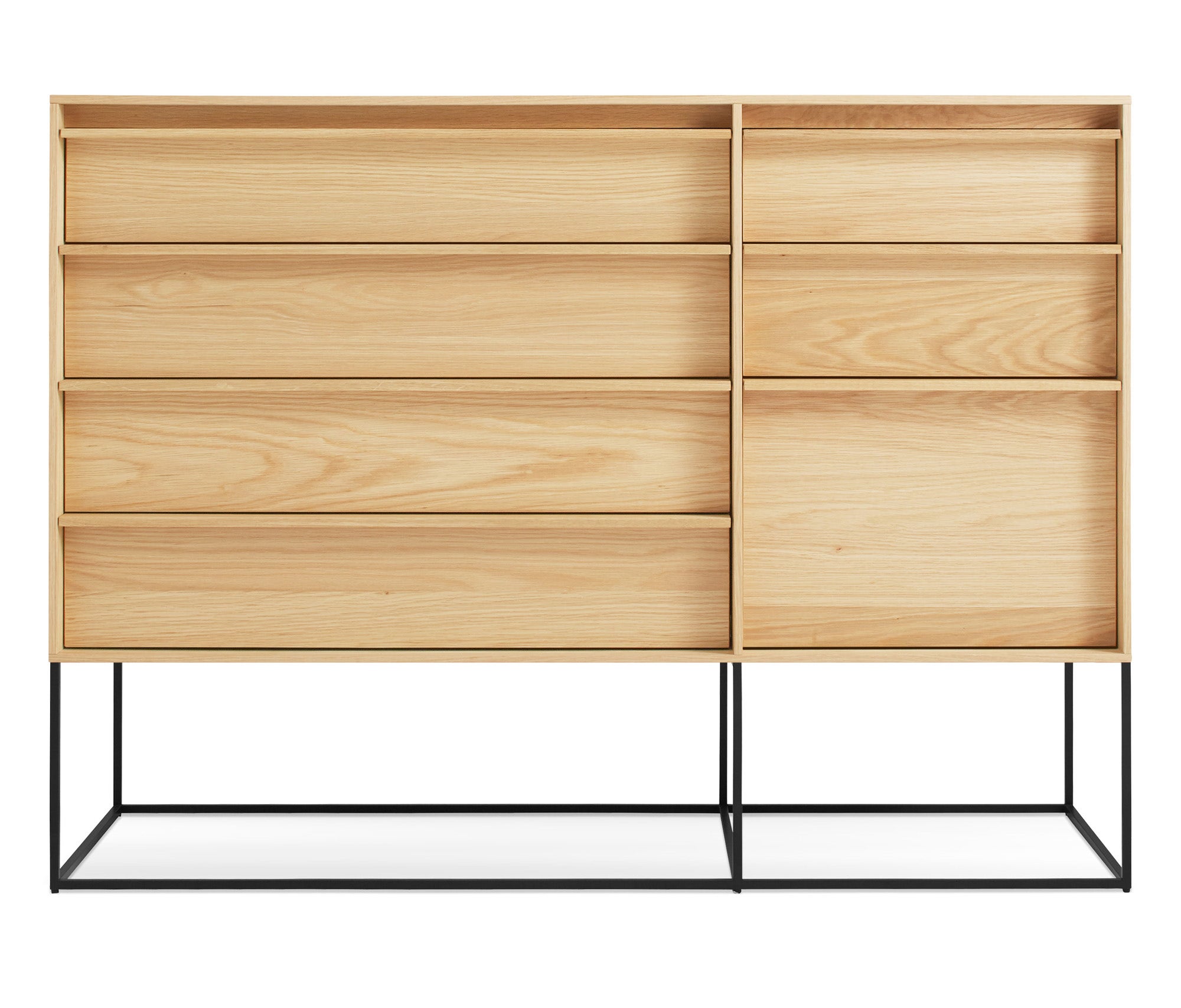 The Rule Collection serves up well considered planes and angles that are ready to slay clutter in any room. Deep set drawer fronts, detailed by a wood pull, reinforce the linear design and create a seductive shadow line. Dusk-colored drawer and door interiors provide a surprise dose of color while a square steel base ties it all together to form an elegantly, uncomplicated form. Available in six shapes suited for any room in the home or office. All with soft close drawers and doors.