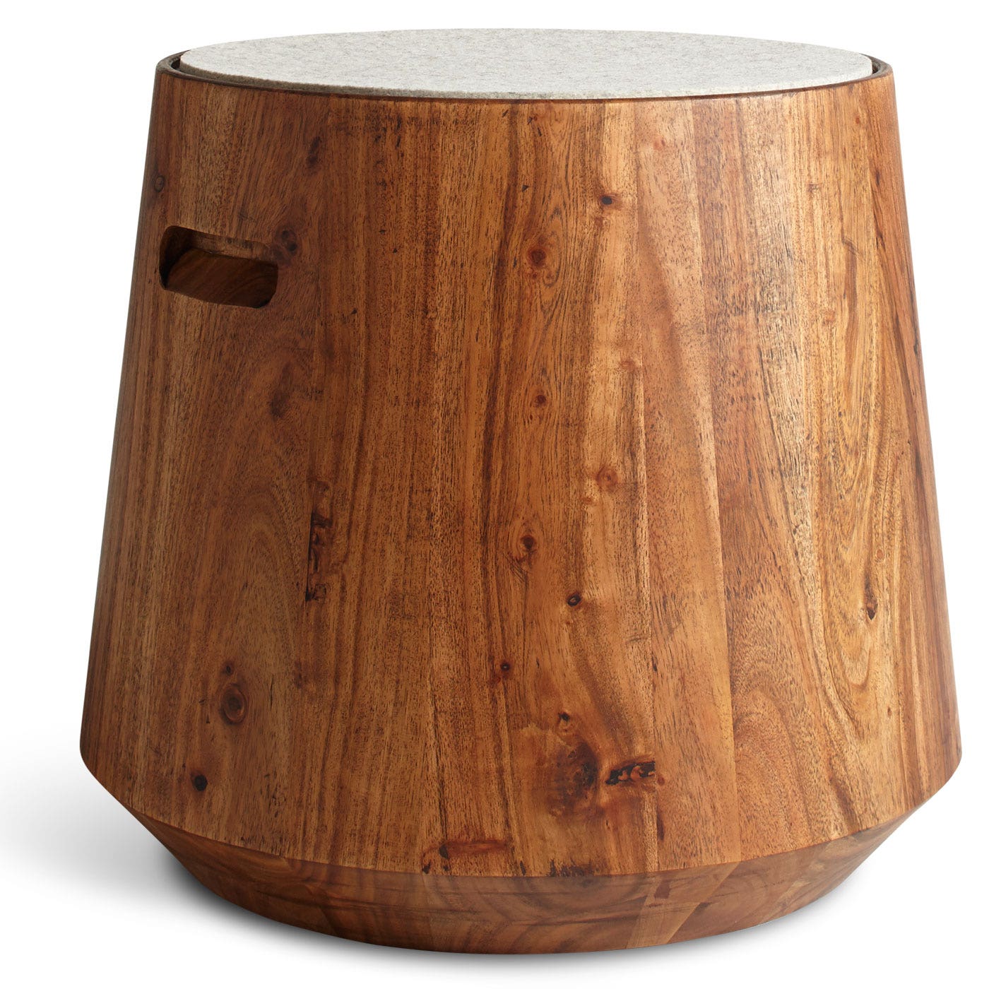 Solid Acacia wood topped with the thick cut felt top of your choice in nine colors (also sold separately) to suit your decor or mood. Cut out handles invite easy relocation for use as spontaneous seating, side tables or an ottoman.