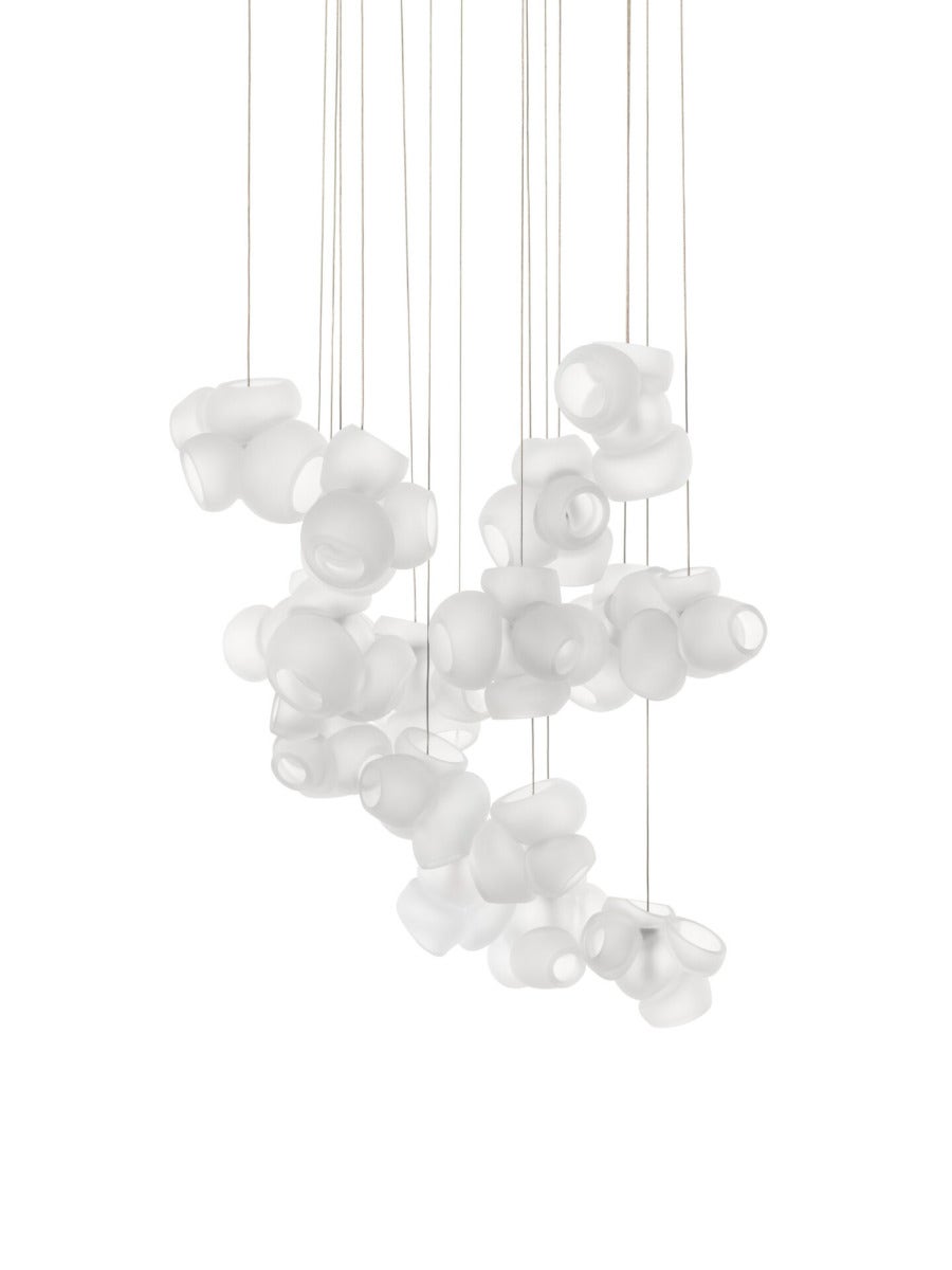 100.16 is composed of 16 hand-blown glass pendants that attach to a white powder-coated canopy using a fixed length jack connection.