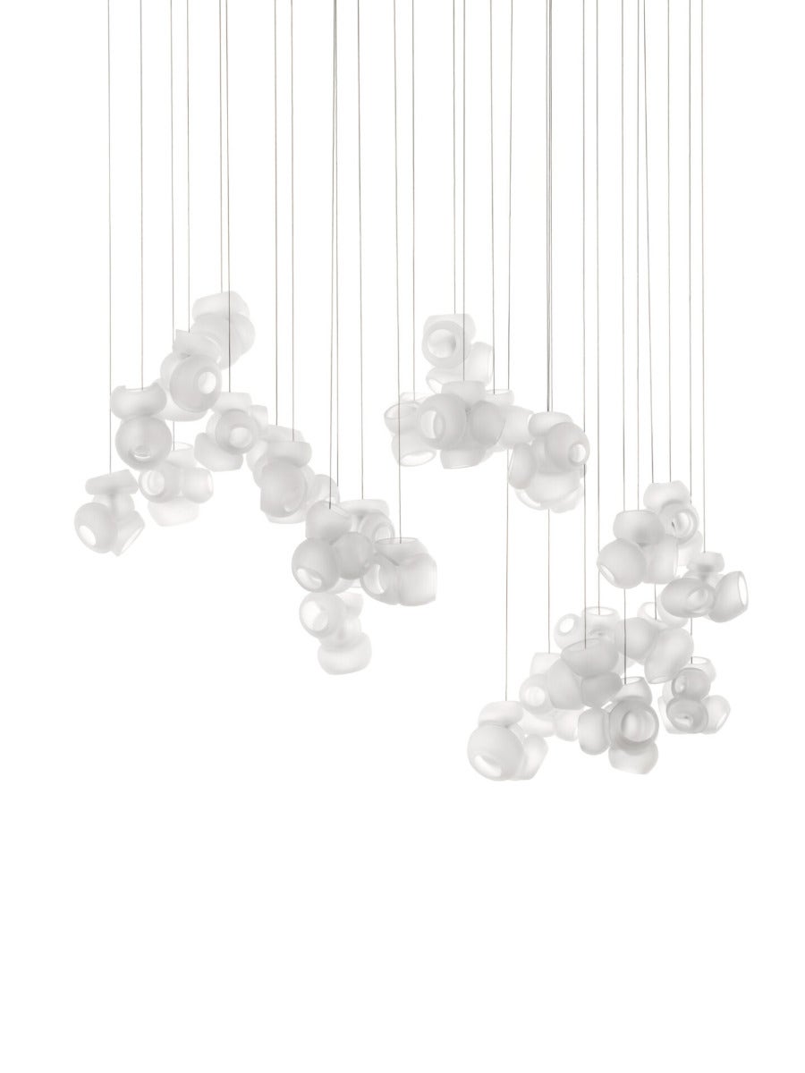 100.28 is composed of 28 hand-blown glass pendants that attach to a white powder-coated canopy using a fixed length jack connection.