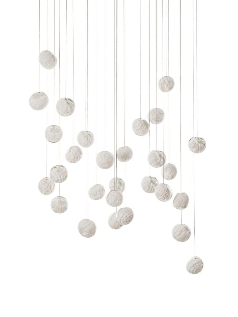118.28 is composed of 28 hand-blown glass pendants that attach to a white powder-coated canopy using a fixed length jack connection.