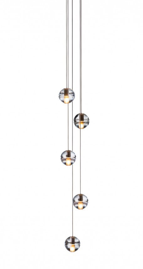 14.5 is a random configuration of five 14 pendants hung from a round canopy. The pendants are designed to hang in a random configuration at times clustering and grouping together and others trailing off. The result is an ambient chandelier or field of light. The pendant drop lengths on this chandelier are adjustable up to the specified maximum.