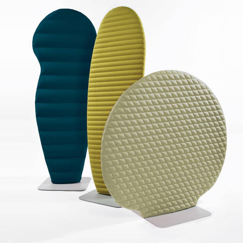 BuzziPlant is a free standing, sound absorbing privacy screen available in three shapes and patterns. It’s made of a honeycomb cardboard core filled with acoustic foam and upholstered in fabric. The fabric surface is tackable. The baseplate is powder coated metal.