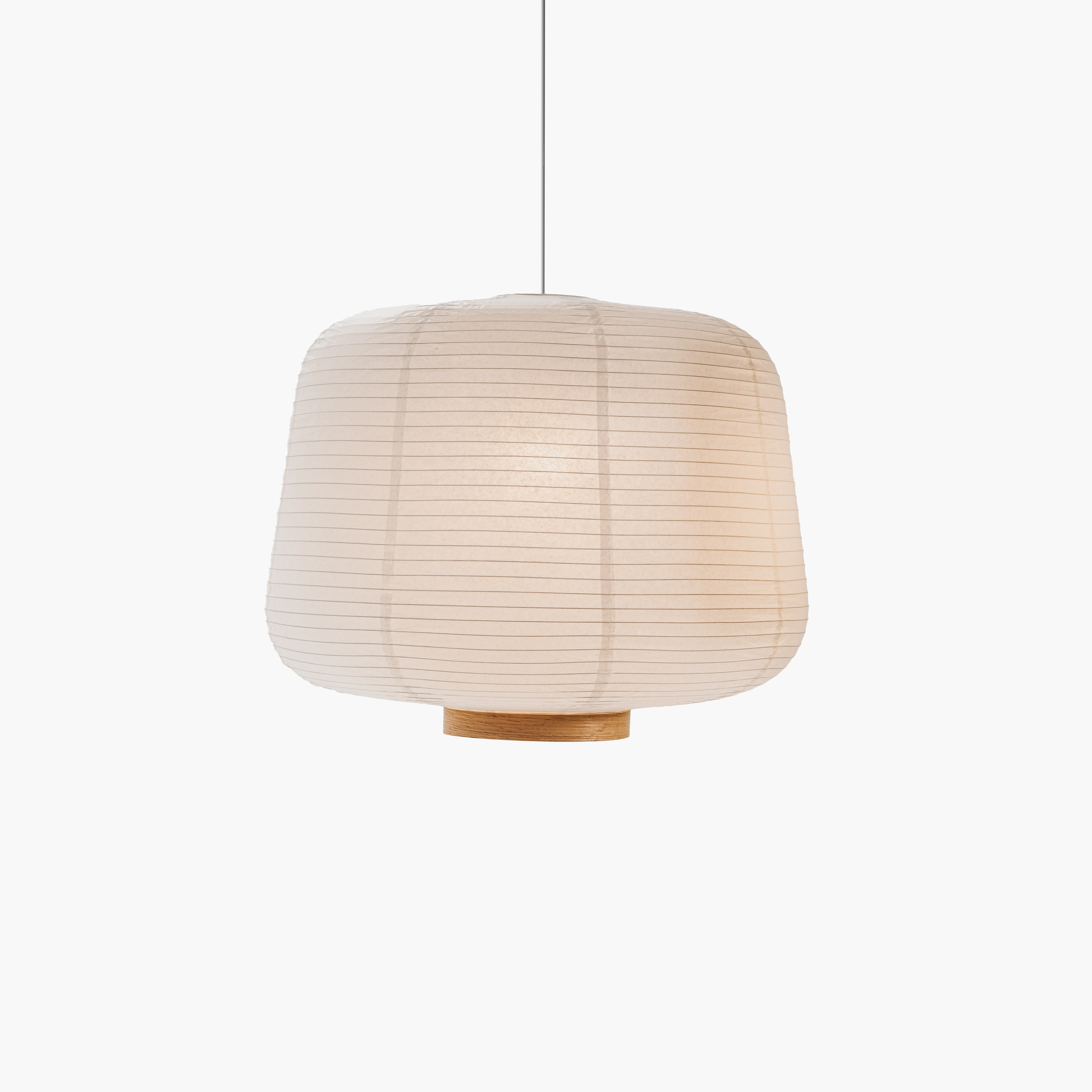 - Shade in rice paper, wooden ring in Oak/Black Stain, frame stretcher in white matt metal.