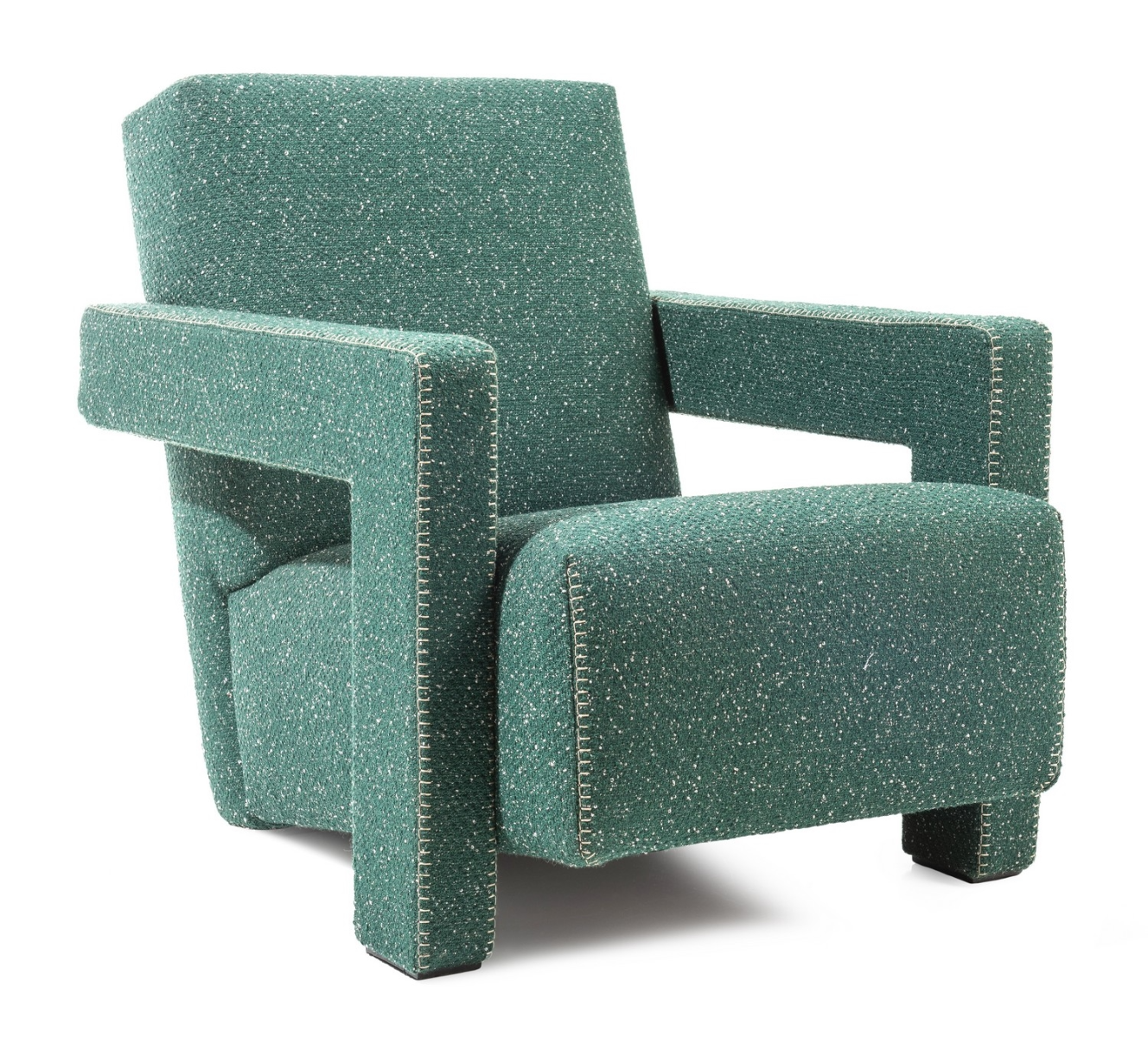 Utrecht lounge pieces are distinguished by the contrasting thread colors, stitched in either a blanket or zig zag pattern. The seat and backrest are supported by steel rods with elastic bands. The armrests are made of poplar wood. The padding is comprised of polyurethane foam in varying densities. The glides are made of black plastic.