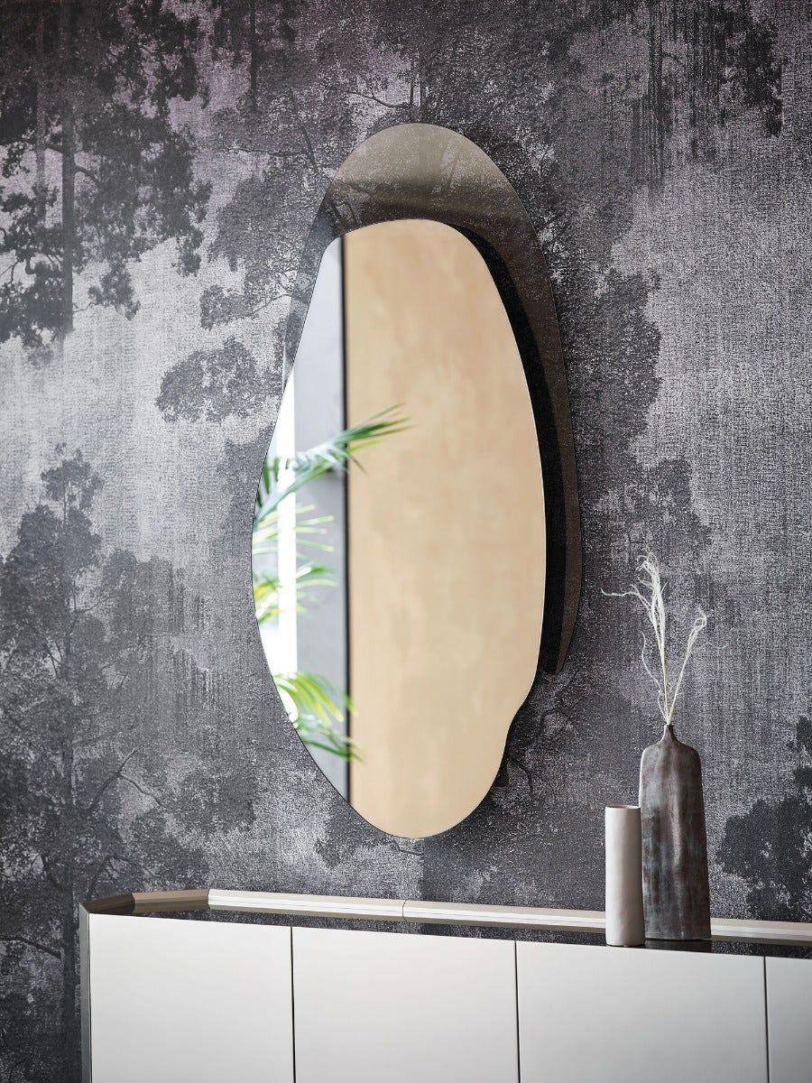Wall mirror in mirrored fumé glass with fumé glass frame. Optional: led light.