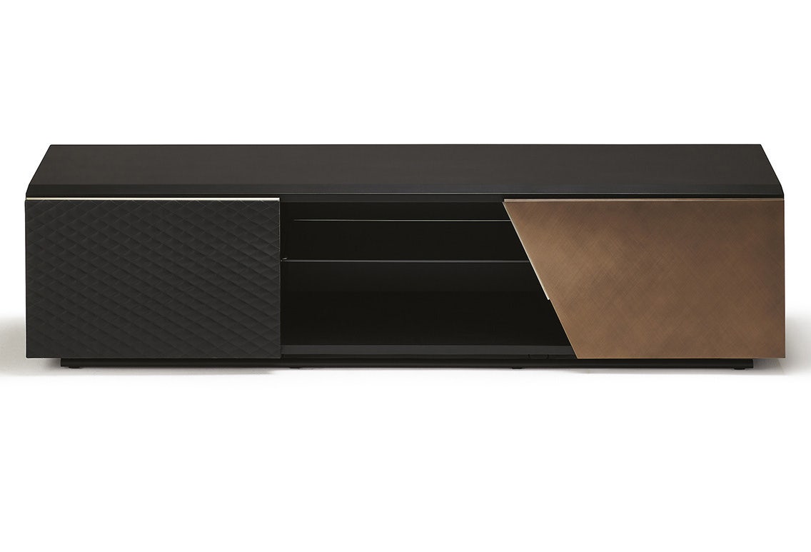 TV cabinet in black (GF73) embossed lacquered wood. Black (GFM73) embossed steel base. Left door covered and quilted in synthetic leather or soft leather as per sample card with titanium (GFM11) embossed aluminum profiles. Right door in Brushed Bronze with black chrome (06) details. Internal fumé glass shelves. Colour and brushing variations of the Brushed finish are characteristics of the handcrafted processing and should not be considered as defects.