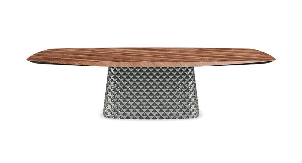 Table with base in mirrored and quilted fumé or bronze curved glass. Version "B": barrel top with angled edges in Canaletto walnut (NC) or burned oak (RB). "Masterwood" version: boat shaped top in Canaletto walnut (NC) or burned oak (RB) made of diagonal wooden planks of different sizes. Oblique and rounded edges.