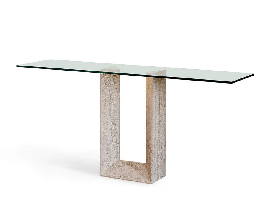 Console with Travertine (TN) or white Carrara (BC) marble base. Clear glass 12 mm. The top is laid on the base.