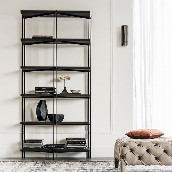 Modular bookcase with frame in titanium (GFM11), graphite (GFM69) or black (GFM73) embossed lacquered steel. Shelves in Canaletto walnut (NC) or burned oak (RB). Satin bronze lacquered steel details. For the freestanding use at least two modules are recommended.