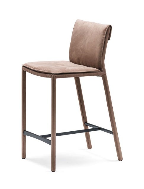 Stool with steel frame. Cushions and covering in synthetic leather, fabric, micro nubuck or soft leather as per sample card. The cover is not removable.