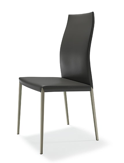 Upholstered chair with or without arms with steel structure in chromed (08) or black chrome (06), black (OP17), pearl (GFM70), graphite (OP69), titanium (GFM11) or bronze (GFM18) finish and covered in synthetic leather, micro nubuck or soft leather as per sample card. Quilted seatback cover. The cover is not removable.