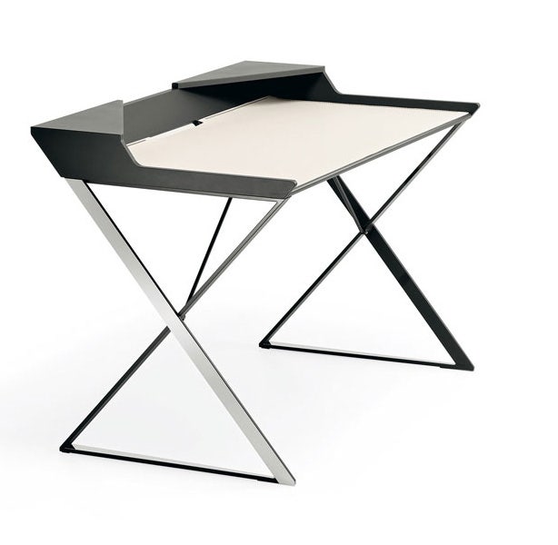 Desk with matt white (OP71) or graphite (OP69) painted frame and profile in polished stainless steel. Top in lacquered white (GF71) or graphite (GF69) embossed MDF. Leather pad as per sample card.
