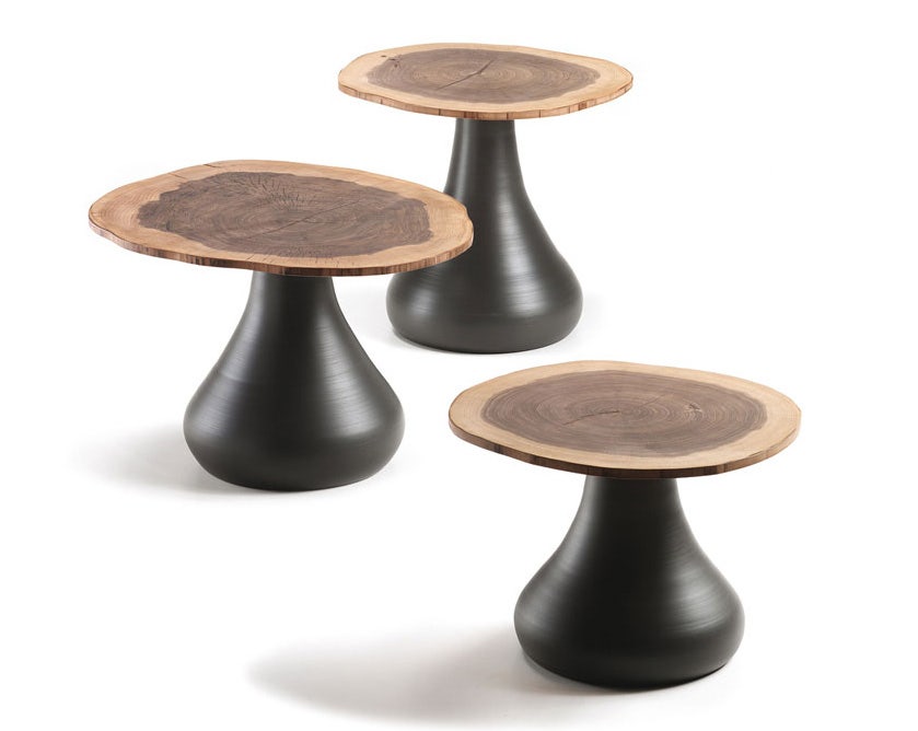 Coffee table with base in graphite (GFM69) embossed lacquered aluminum. MDF veneered top in log section of walnut tree trunk. Aproximate sizes of the top, each piece is unique and different in shape and size.