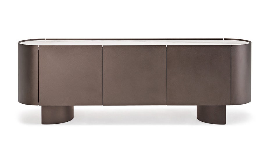 Sideboard with wood frame covered in bronze (GFM18) or Oxybrass embossed lacquered steel. Top in bronze mirrored glass or in ceramic Marmi matt Golden Calacatta (KM05), glossy Golden Calacatta (KM06), matt Portoro (KM07), glossy Portoro (KM08), Breccia (KM12) or Colosseo (KM21). Feet in bronze (GFM18) embossed painted steel. Internal shelves.