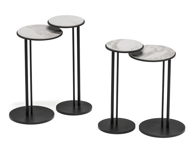 Coffee table with base in titanium (GFM11), bronze (GFM18), graphite (GFM69), pearl (GFM70) or black (GFM73) embossed lacquered steel. Marmi ceramic matt Portoro (KM07), glossy Portoro (KM08), Makalu (KM11), Breccia (KM12), Kaindy (KM16) or Colosseo (KM21) top.