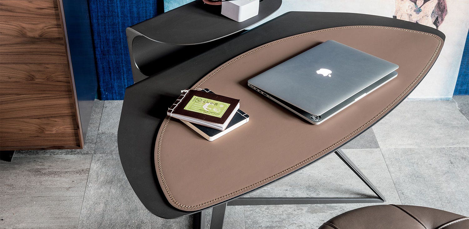 Desk with frame and top in titanium (GFM11), bronze (GFM18), graphite (GFM69) or white (GFM71) embossed lacquered steel. Leather pad as per sample card.